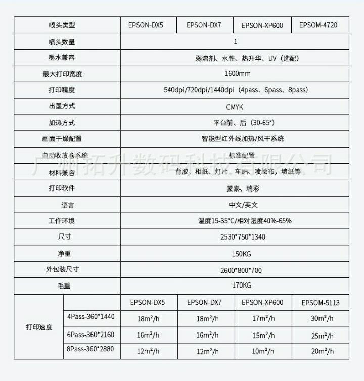 Composants notables : Moteur haute vitesse, plateforme entièrement en aluminium, têtes d'impression Epson, fonction de levage de la pile d'encre, système d'enroulement automatique du papier, et séchage infrarouge.
