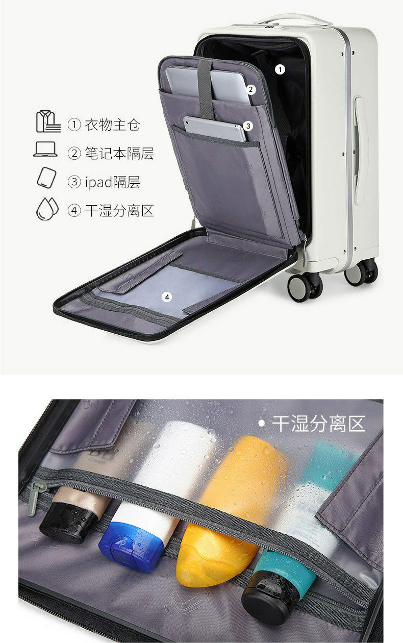 Valise multifonctionnelle, valise trolley rechargeable, avec un compartiment frontal à ouverture rapide. Valise d'embarquement à ouverture frontale