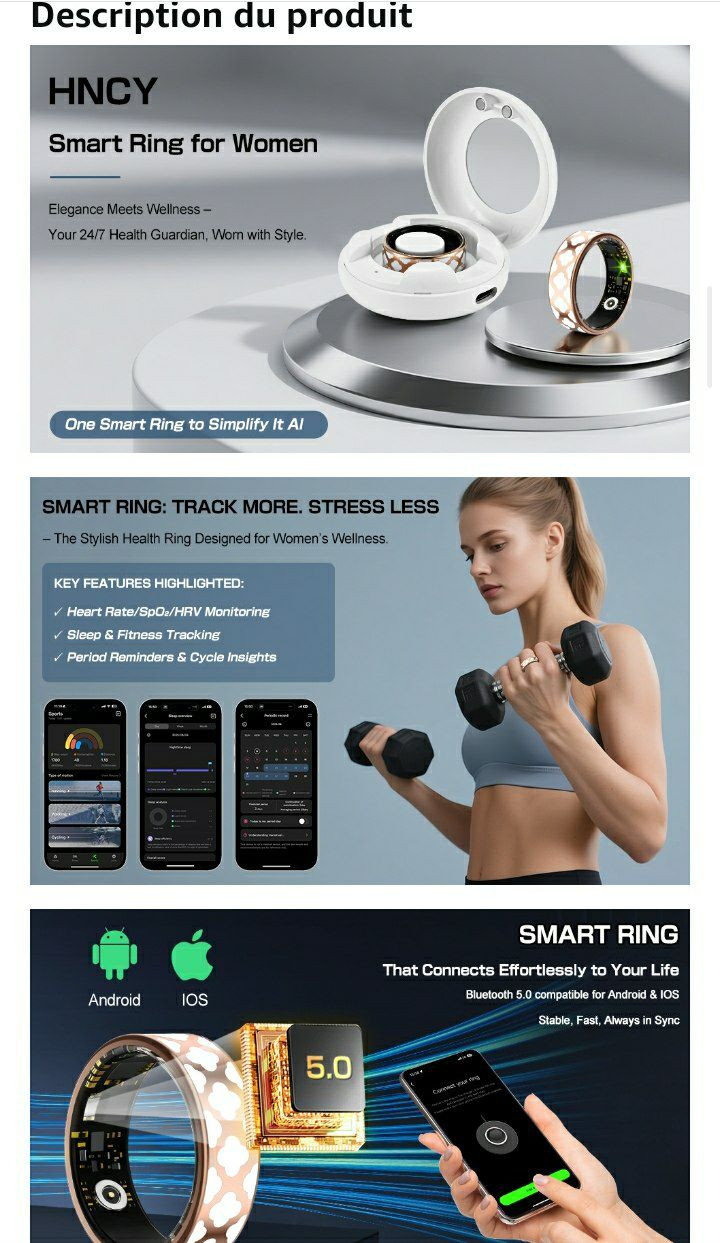 Smart Ring, Bague intelligente pour fréquence cardiaque, sang oxygène sommeil exercice podomètre surveillance étanche multifonction pour Femmes et Hommes,