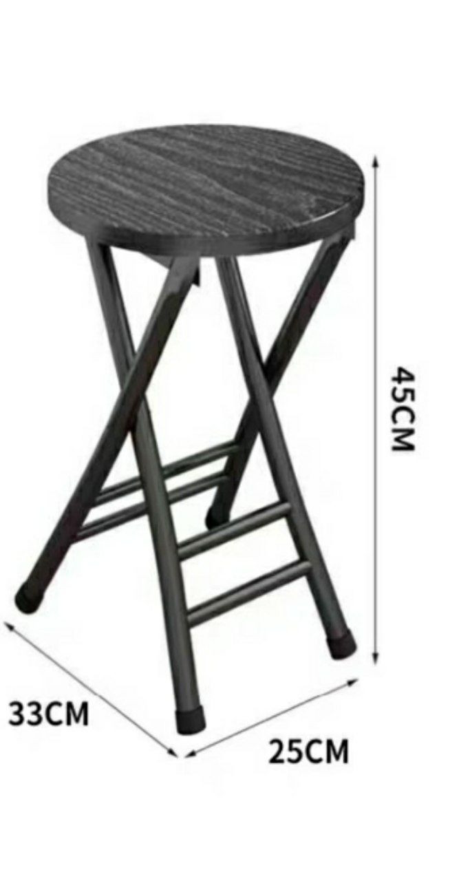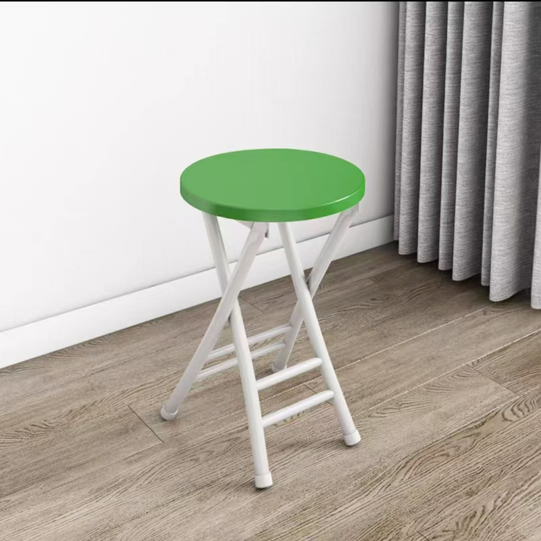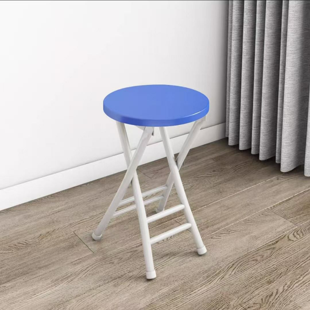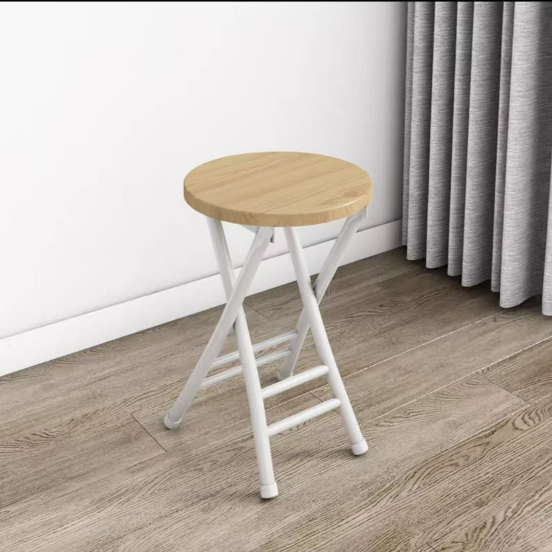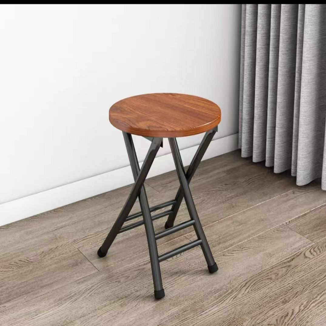Tabouret pliant rond avec un plateau en bois et un cadre en métal portable de maison.
