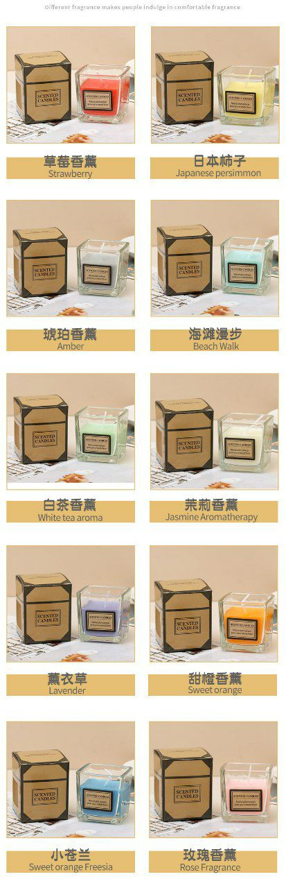Bougies parfumées générique en pot de verre carré avec sa boîte d'emballage, fabriquée à partir d'extraits naturels de plantes.
