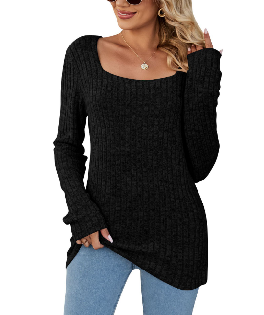 Hauts pour femmes automne et hiver nouveaux produits col carré bande de fosse brossé décontracté version longue T-shirt européen et américain femmes